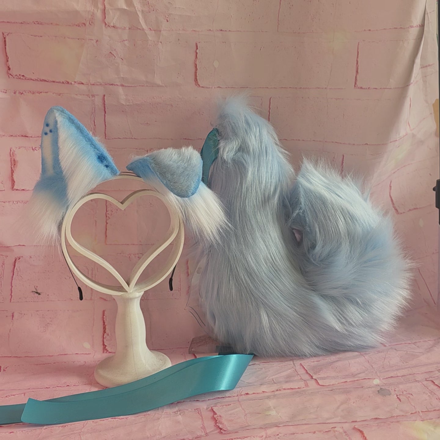 • The back is light blue fur, the inner ear is white fur decorated with airbrushed light blue details.