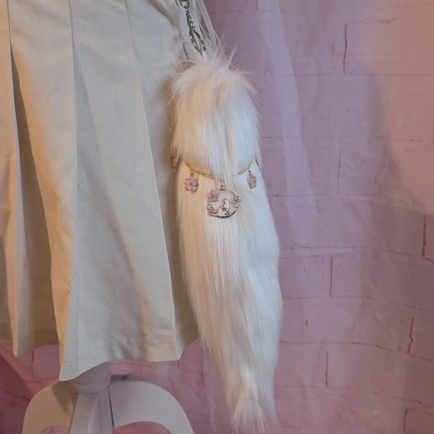 - Comes with a detachable handmade charm. It is a gold chain with pink blossom charms and a central gold ring charm with a white cat and pink blossoms in it.